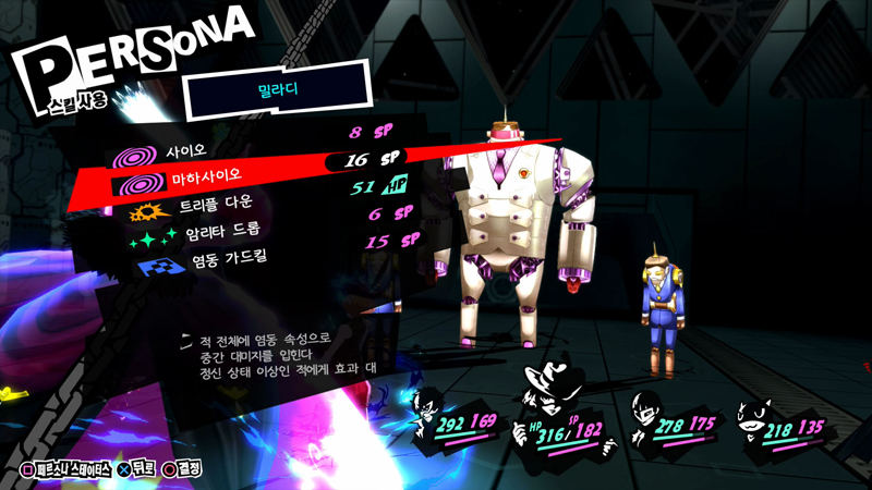 이 경우도 체력이 낮다면 죽게 되니 동결 상태이상 내성을 챙겨두거나 빙결흡수가 되는 페르소나를 챙겨두는 쪽이 좋다.