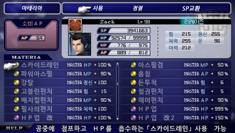 4. 3번으로 만든 마테리아 2개 합성. HP업/HP+100% + HP업/HP+100% = HP업/HP+150% (15000골드 필요)