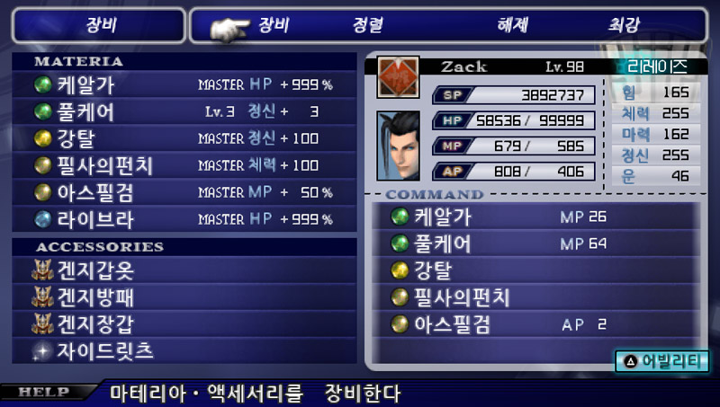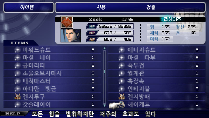 레벨 97 / HP 99999 / MP 580 / AP 403 / 힘 165 / 체력 255 / 마력 162 / 정신 255 / 운 46