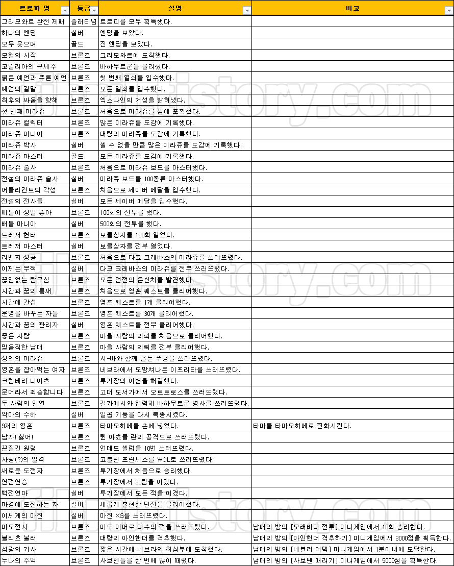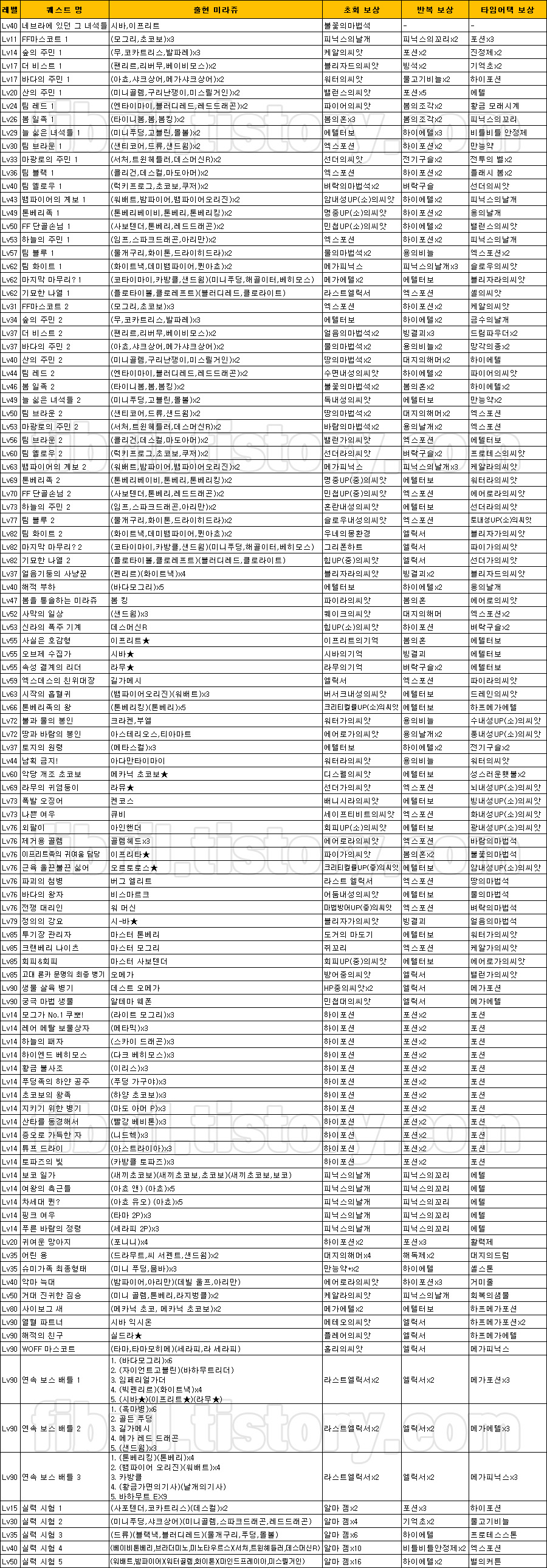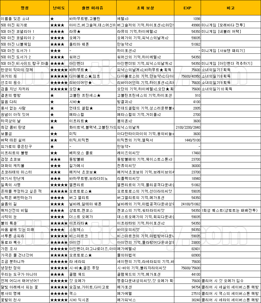 퀘스트 목록은 이하의 표와 같다.