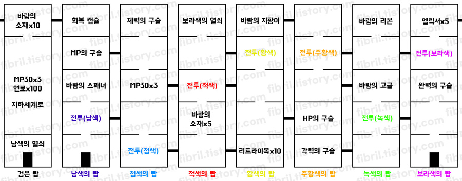 위의 맵은 편의상 약간 도식화한 것으로 일부 탑(검은 탑, 남색의 탑)의 경우 어쩔 수 없이 좌우반전된 형태이다.