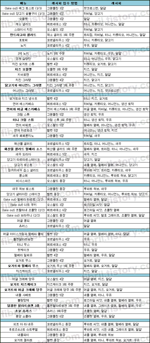 모든 요리 레시피는 이하와 같다.