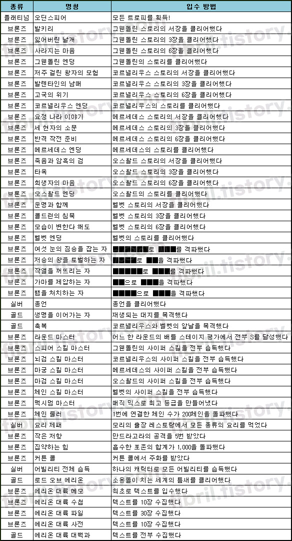 트로피 목록은 이하의 표를 참고해주기 바라며 스포를 피하기 위해 일부 정보는 지웠으니 양해 바란다.