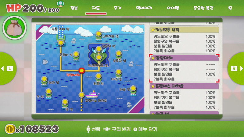 전부 찾았는지는 지도에서 해당 지역의 키노피오 구출률이 100%가 되었는지를 확인하면 된다.