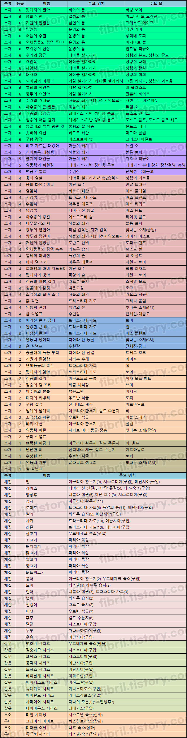 한 소재를 여러 몹이 주는 경우도 있는데 되도록 많이 나오는 몹들 위주로 정리했으니 참고하자.